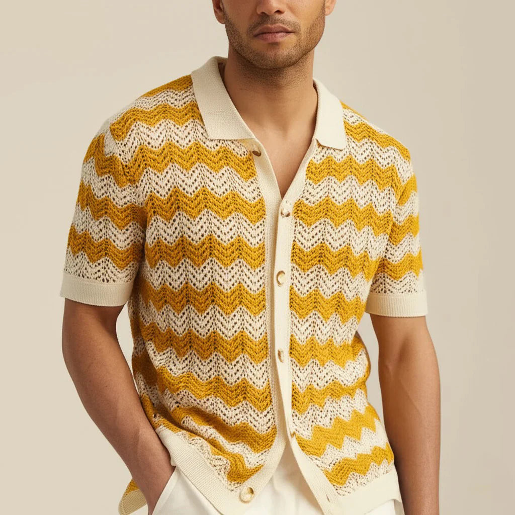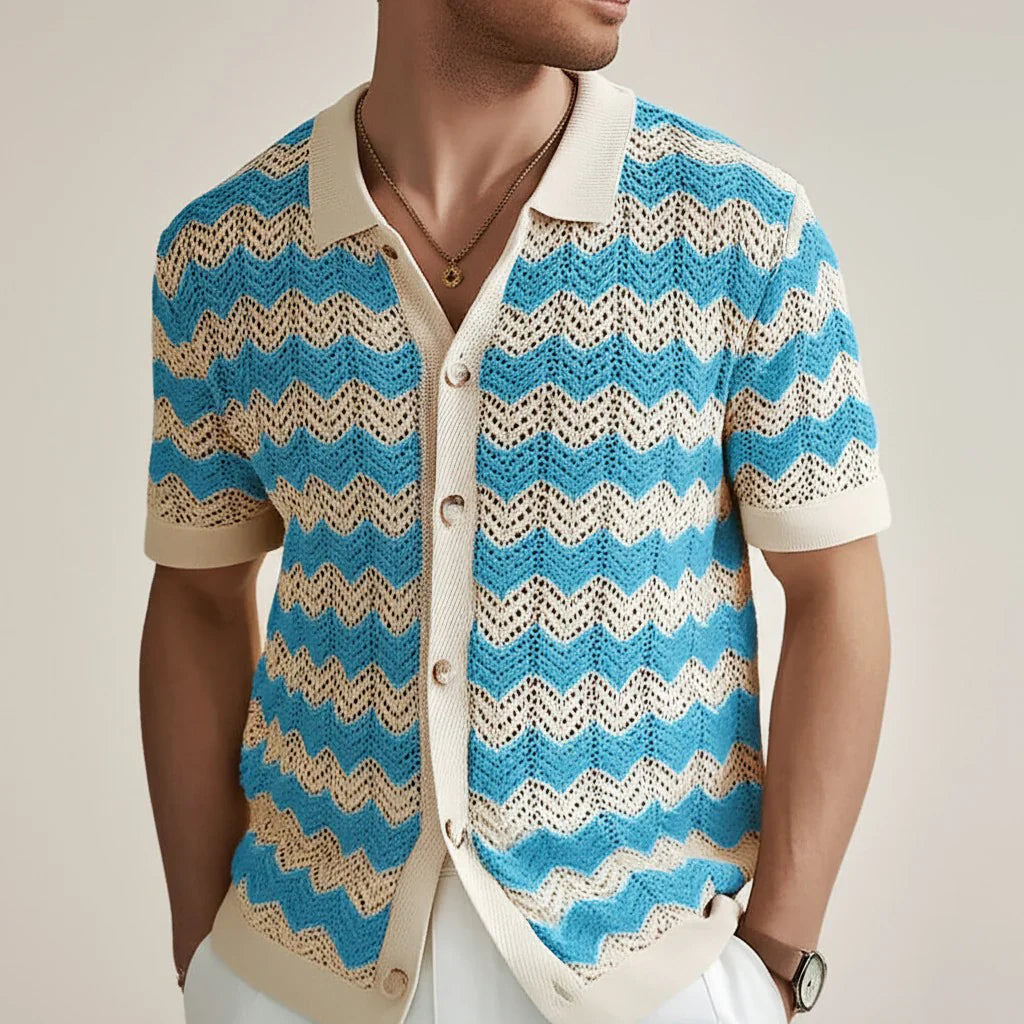 Košile Basile kombinuje klasický pánský styl s moderní texturou a prodyšností. Je precizně pletená v designu síťoviny s vlnkovým vzorem, který poskytuje vizuální šmrnc a optimální cirkulaci vzduchu. Lehké, volné střihy ji činí ideální pro letní uvolněné chvíle – ať už na zahradní párty, dovolené nebo večer venku.